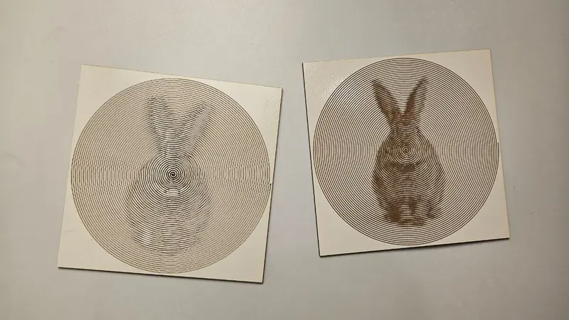 See what you can engrave with the Photo Spiral Generator. Both pieces below were laser-engraved on 2 mm white plywood — the spiral path traces the entire photo in one continuous unbroken line, with thickness varying to recreate the tones.